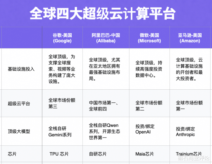 第一,每一家企业每年都有着千亿级别的基础设施投资。第二,每一家企业都有着百万级服务器的计算集群与顶级的云调度能力。第三,每一家企业都有着世界一流水平的大模型。第四,每一家企业都有着自己的AI芯片设计与布局能力。