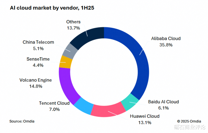 近日,国际权威市场调研机构英富曼(Omdia)发布了一篇《中国AI云市场,1H25》的报告。2025年上半年,中国AI云市场规模达223亿元,阿里云以35.8%的市场份额绝对领先,超过2到4名的市场份额总和。报告还预测,中国AI云市场在接下来几年还将迎来持续爆发式增长,销售规模在2025年全年预计达518亿元,到2030年有望达到1930亿元规模。